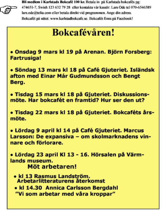 ”Kollade lite på Karlstad bokcafés hemsida och blev otroligt imponerad! Vilken förening och vilken samling föreläsare som ni träffat genom åren. Alla har ju varit där! Varför finns inget sådant bokcafé i Göteborg?"