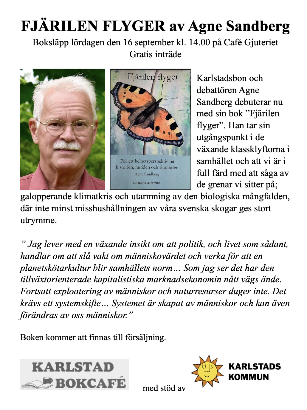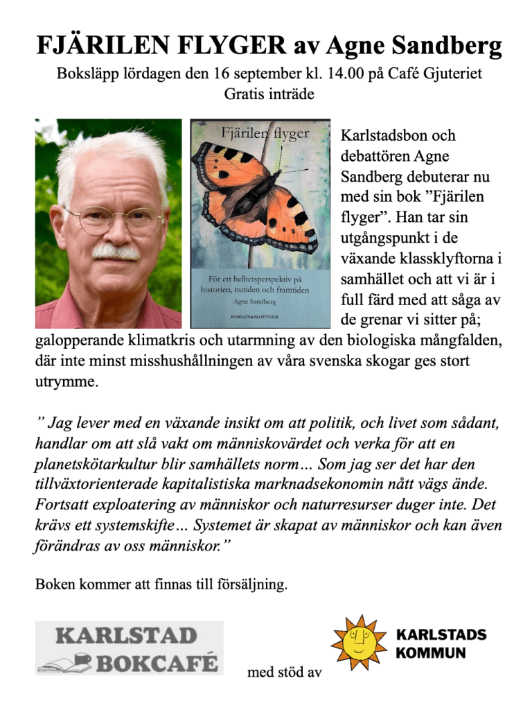 Karlstadsbon och debattören Agne Sandberg debuterar nu med sin bok Fjärilen flyger. Han tar sin utgångspunkt i de växande klassklyftorna i samhället och att vi är i full färd med att såga av de grenar vi sitter på; galopperande klimatkris och utarmning av den biologiska mångfalden, där inte minst misshushållningen av våra svenska skogar ges stort utrymme.