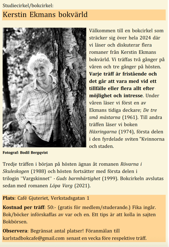 Observera: Begränsat antal platser! Föranmälan till karlstadbokcafe@gmail.com senast en vecka före respektive träff.