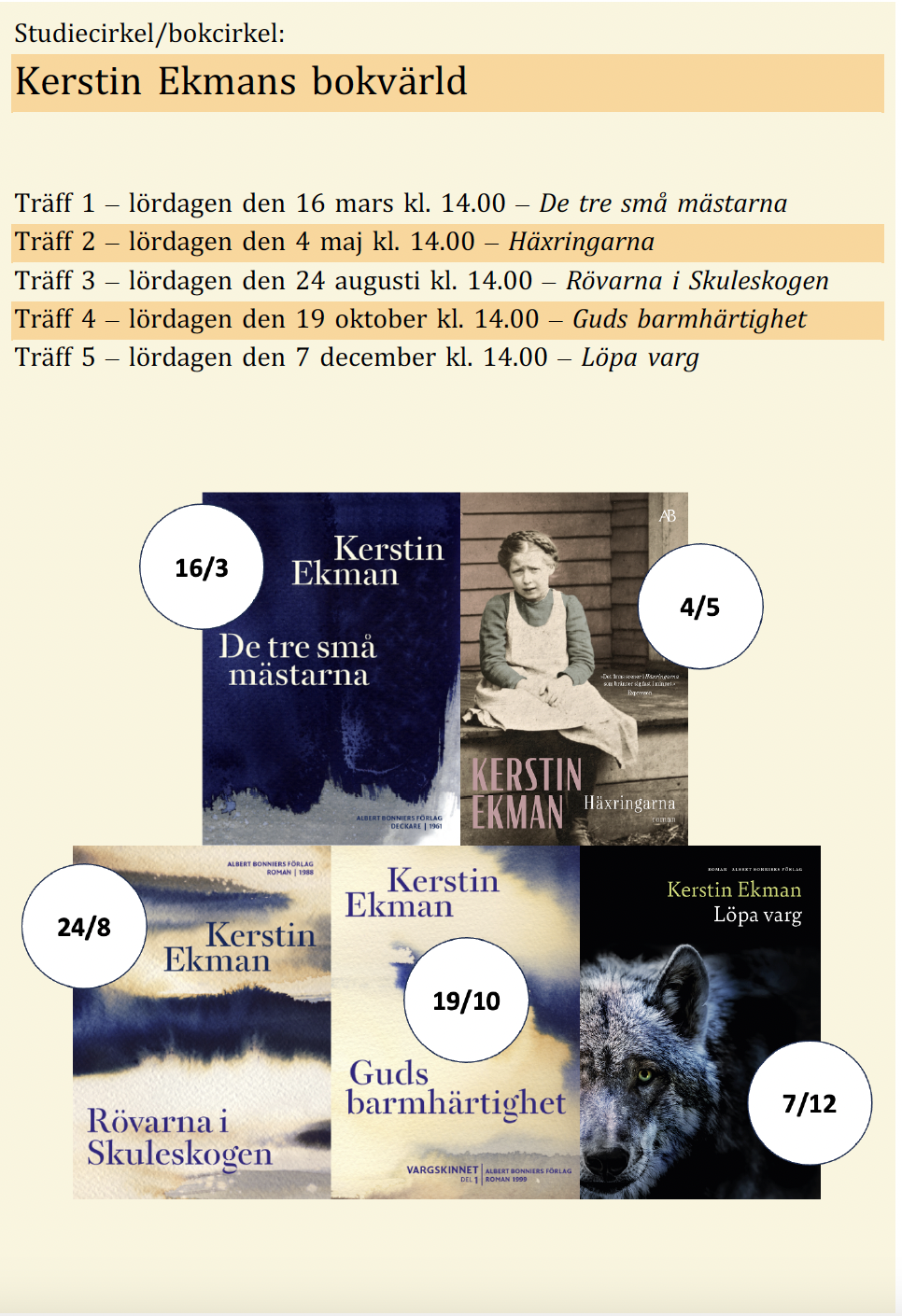 Välkommen till en bokcirkel som sträcker sig över hela 2024 där vi läser och diskuterar flera romaner från Kerstin Ekmans bokvärld. Vi träffas två gånger på våren och tre gånger på hösten. Varje träff är fristående och det går att vara med vid ett tillfälle eller flera allt efter möjlighet och intresse. Under våren läser vi först en av Ekmans tidiga deckare; De tre små mästarna (1961).