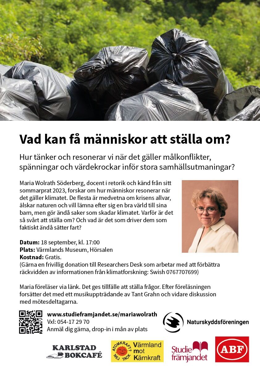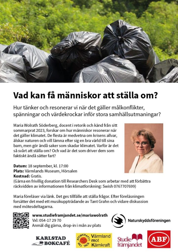 Maria Wolrath Söderberg, docent i retorik och känd från sitt sommarprat 2023, forskar om hur människor resonerar när det gäller klimatet. Just nu leder Maria också ett projekt där man studerar olika organisationer som har som syfte att stödja eller befordra omställning som gäller energi- och resurseffektivisering.