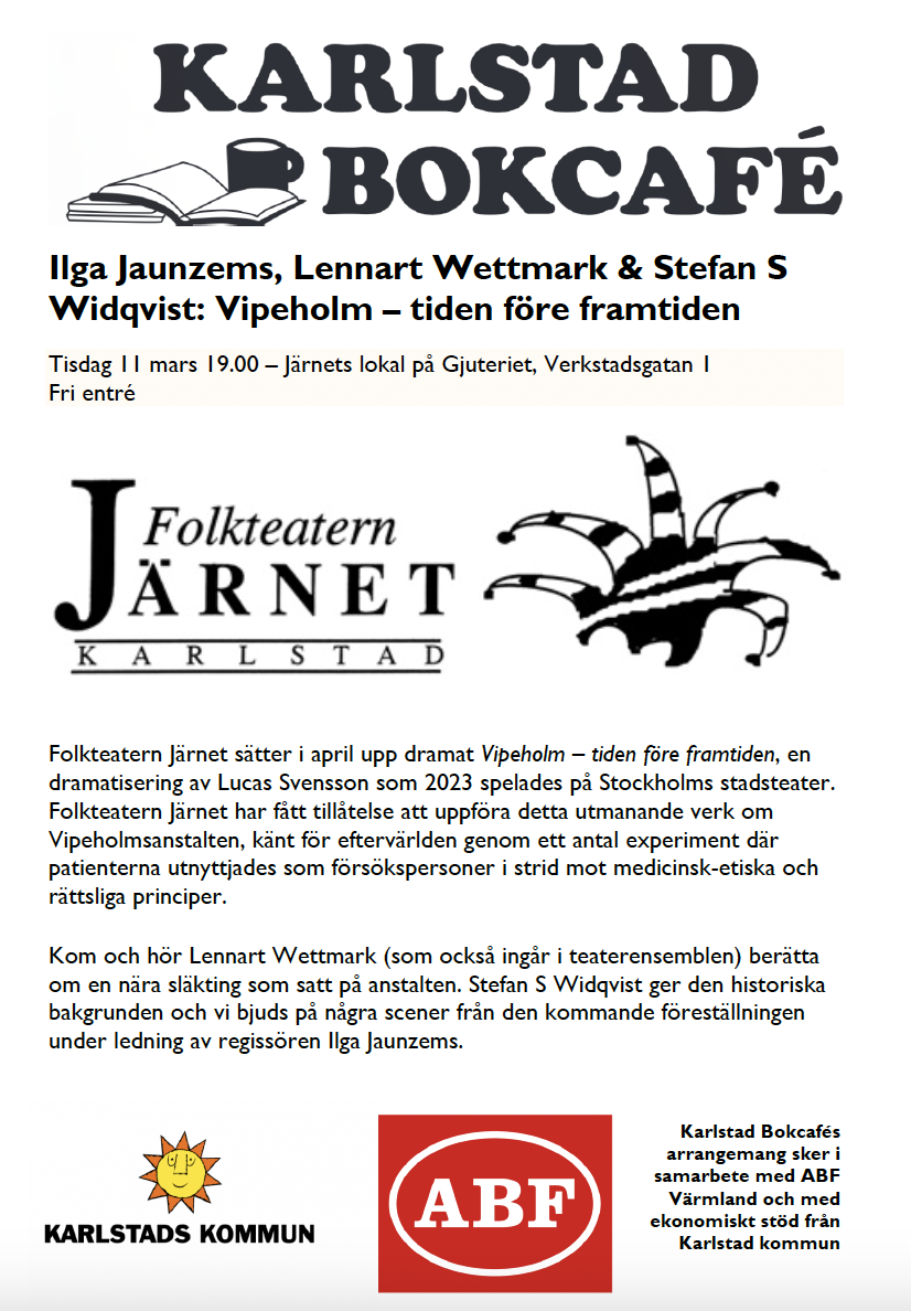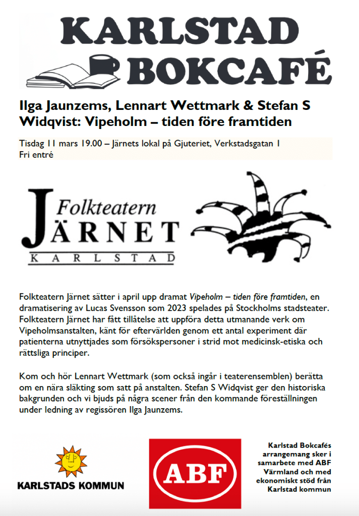 Kom och hör Lennart Wettmark (som också ingår i teaterensemblen) berätta om en nära släkting som satt på anstalten. Stefan S Widqvist ger den historiska bakgrunden och vi bjuds på några scener från den kommande föreställningen under ledning av regissören Ilga Jaunzems.