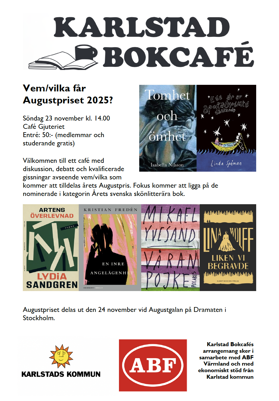 Välkommen till ett café med diskussion, debatt och kvalificerade gissningar avseende vem/vilka som kommer att tilldelas årets Augustpris. Fokus kommer att ligga på de nominerade i kategorin Årets svenska skönlitterära bok.