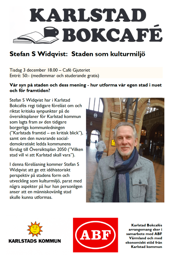 Stefan S Widqvist har i Karlstad Bokcafés regi tidigare föreläst om och riktat kritiska synpunkter på de översiktsplaner för Karlstad kommun som lagts fram av den tidigare borgerliga kommunledningen (”Karlstads framtid – en kritisk blick”), samt om den nuvarande social-demokratiskt ledda kommunens förslag till Översiktsplan 2050 (”Vilken stad vill vi att Karlstad skall vara”).
