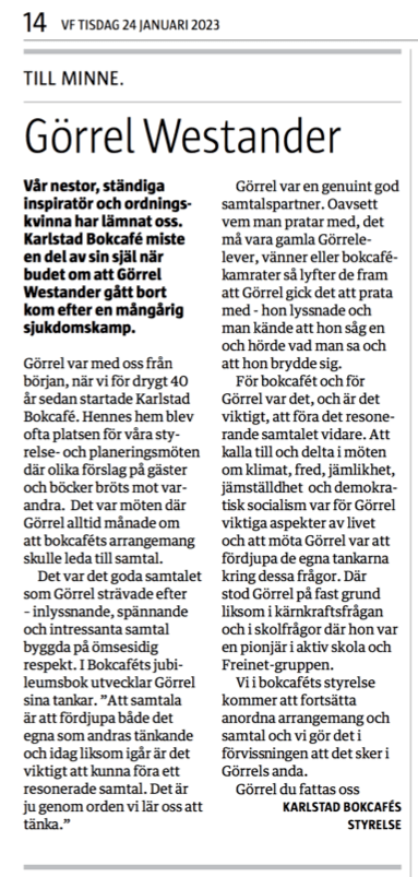 ”När jag bodde i Oslo besökte jag ofta Litteraturhuset. Där kunde man lyssna till föredrag och diskussioner inom vitt skilda områden. Att det fanns en bokhandel vid entrén, restaurang och en tidningshörna gjorde inte platsen mindre intressant. När jag flyttade hem till Karlstad kände jag genast saknaden efter Oslos Litteraturhus.Karlstads Bokcafé blev räddningen trots att omfånget inte kan jämföras. Åkte/åker gärna de tre milen från Molkom för att stimuleras och berikas av föredragen och diskussionerna på Bokcafét på Gjuteriet.”