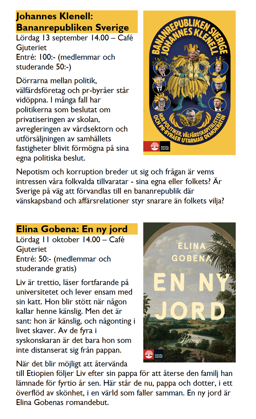 Kommande arrangemang Här presenteras kommande arrangemang under hösten 2025. Missa inga arrangemang! Prenumerera på vårt nyhetsbrev… Dela detta:Dela Klicka för att dela på X (Öppnas i ett nytt fönster) X Klicka för att dela på Facebook (Öppnas i ett nytt fönster) Facebook Klicka för att dela på Tumblr (Öppnas i ett nytt fönster) Tumblr Klicka för att dela på Reddit (Öppnas i ett nytt fönster) Reddit Klicka för att dela via LinkedIn (Öppnas i ett nytt fönster) LinkedIn Klicka för att dela till Pinterest (Öppnas i ett nytt fönster) Pinterest Klicka för utskrift (Öppnas i ett nytt fönster) Skriv ut Klicka för att e-posta en länk till en vän (Öppnas i ett nytt fönster) E-post Gilla Laddar in …