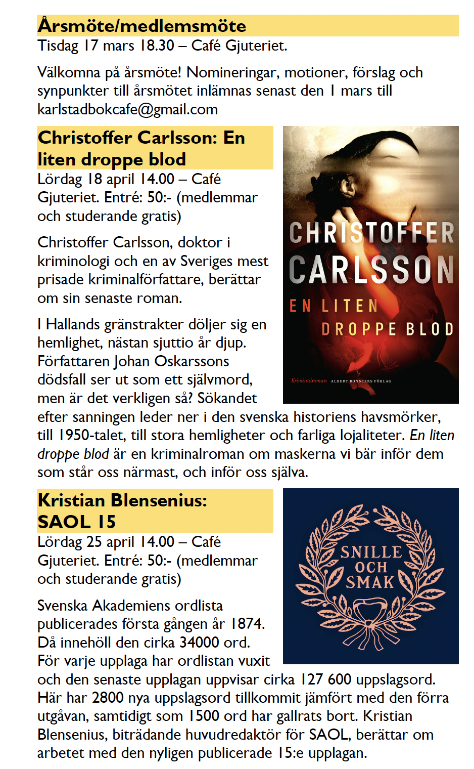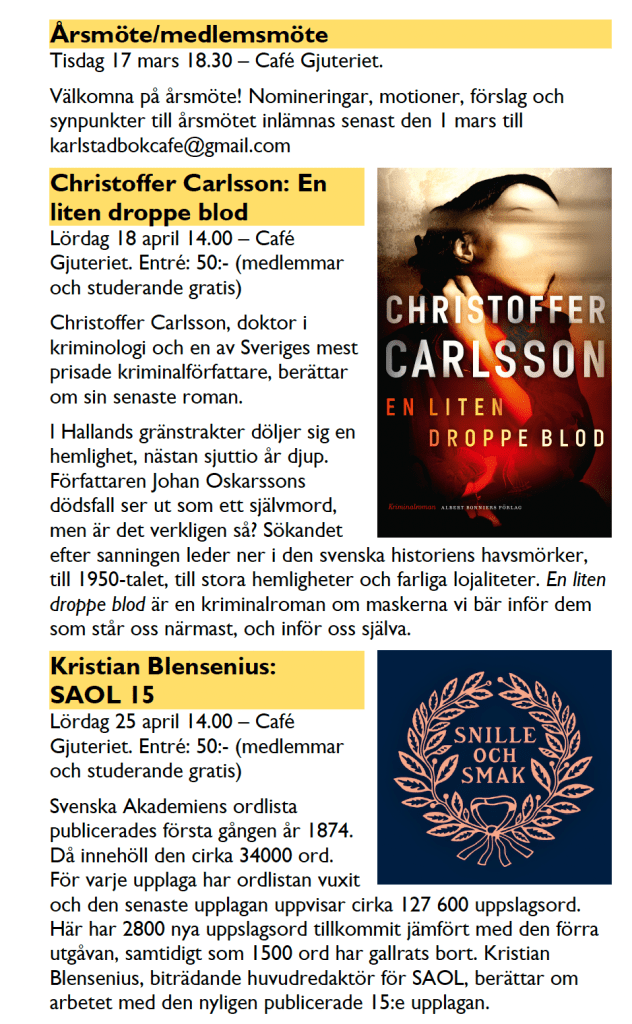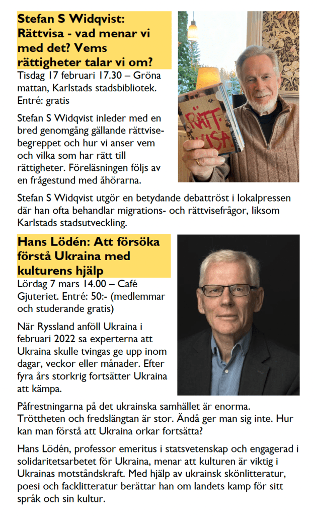 Kommande arrangemang Här presenteras kommande arrangemang under våren 2026. Missa inga arrangemang! Prenumerera på vårt nyhetsbrev… Dela detta:Dela Dela på X (Öppnas i ett nytt fönster) X Dela på Facebook (Öppnas i ett nytt fönster) Facebook Dela på Tumblr (Öppnas i ett nytt fönster) Tumblr Dela på Reddit (Öppnas i ett nytt fönster) Reddit Dela på LinkedIn (Öppnas i ett nytt fönster) LinkedIn Dela på Pinterest (Öppnas i ett nytt fönster) Pinterest Skriv ut (Öppnas i ett nytt fönster) Skriv ut E-posta en länk till en vän (Öppnas i ett nytt fönster) E-post Gilla Laddar in …